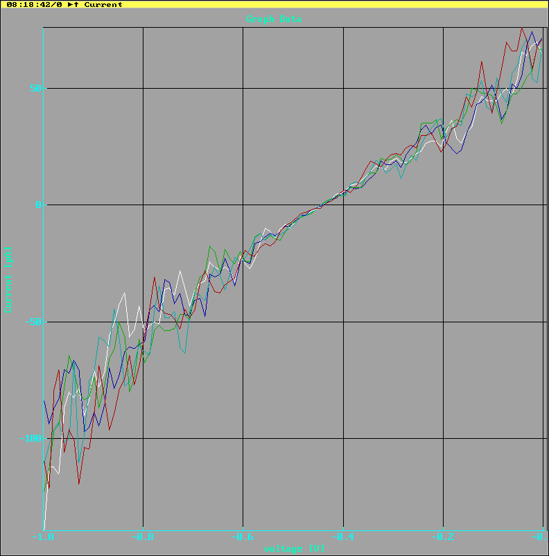 I-V spectroscopy, “Oxides” preamp. 5 different I-Vs and the avarage of 8 I-V curves on the same spot. T=190K.